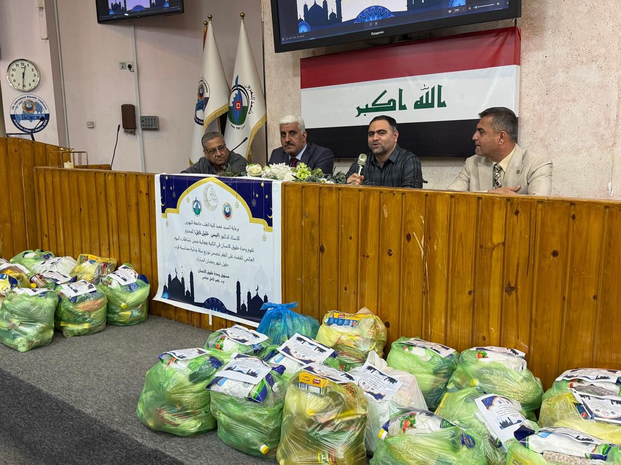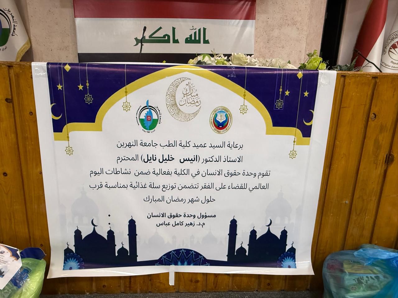 Under the patronage and in the presence of the Dean of the College of Medicine at Al-Nahrain University, Professor Dr. Anis Khalil Nayel, and with the attendance of the Assistant Dean for Scientific Affairs and Student Affairs, the Head of the Supporting Sciences Unit, and the Head of the Human Rights Unit, the College’s Human Rights Unit organized a humanitarian activity as part of the International Day for the Eradication of Poverty, coinciding with the holy month of Ramadan.