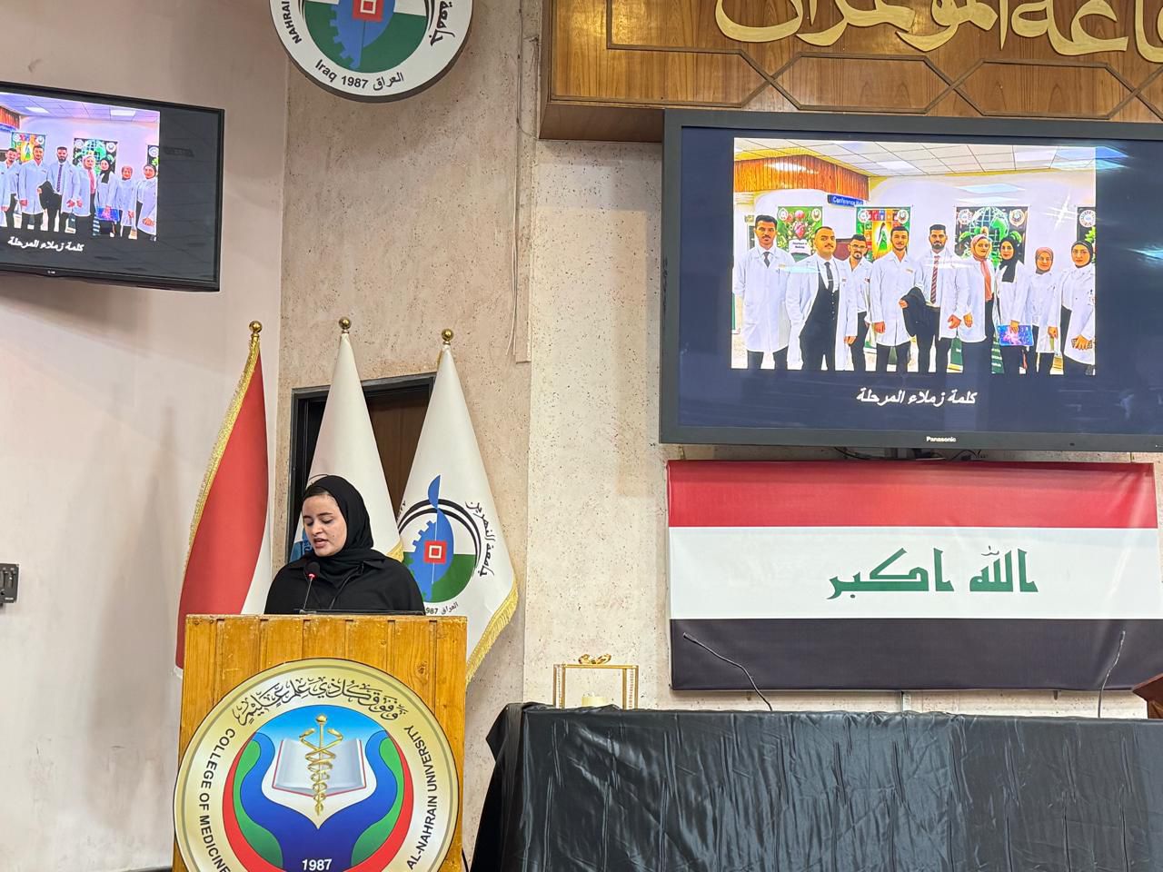 A memorial service was held at the College of Medicine – Al-Nahrain University in honor of fourth-year student (Bara’a Alaa Hadi) on Tuesday, 3/3, at the Conference Hall in the main building. The ceremony was attended by the Assistant Dean for Scientific and Student Affairs, representing the Dean of the College, the Head of the Registration Division, a number of heads of scientific departments, as well as faculty members and students.