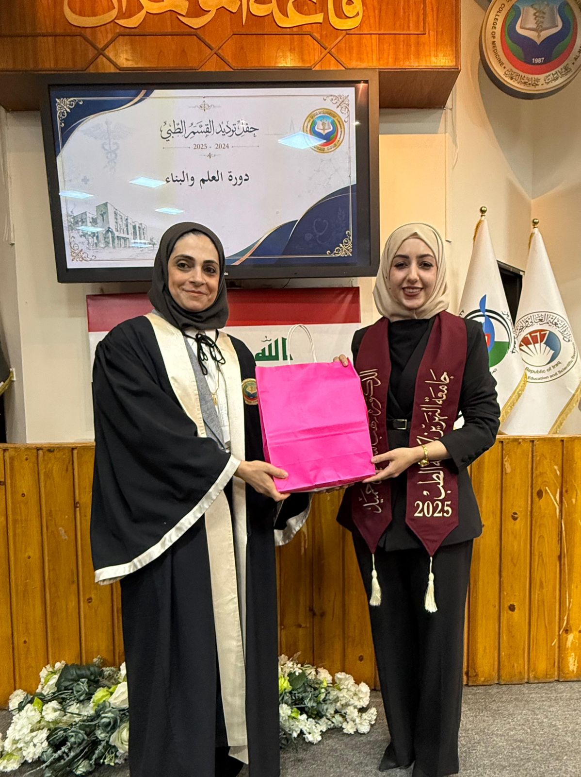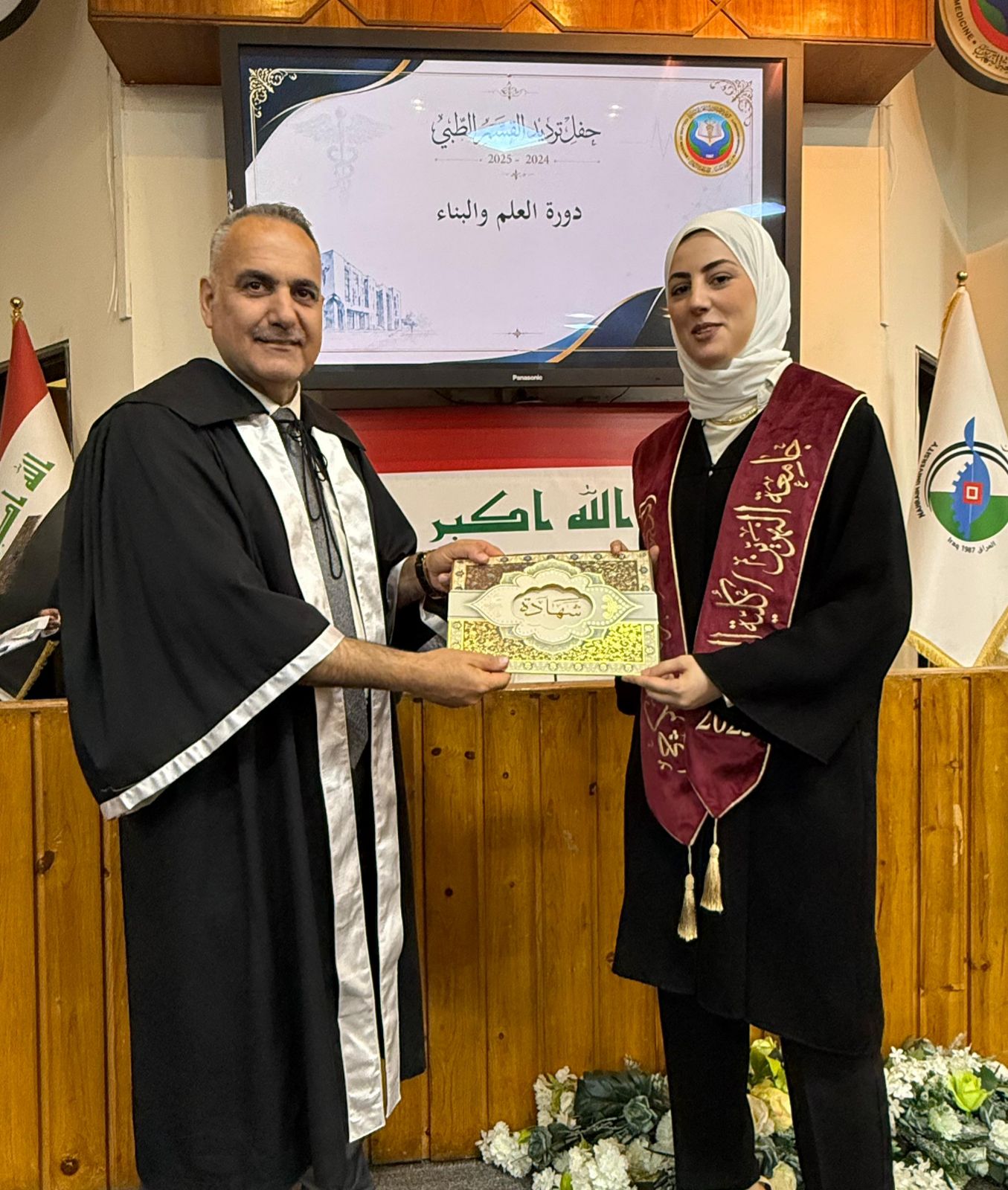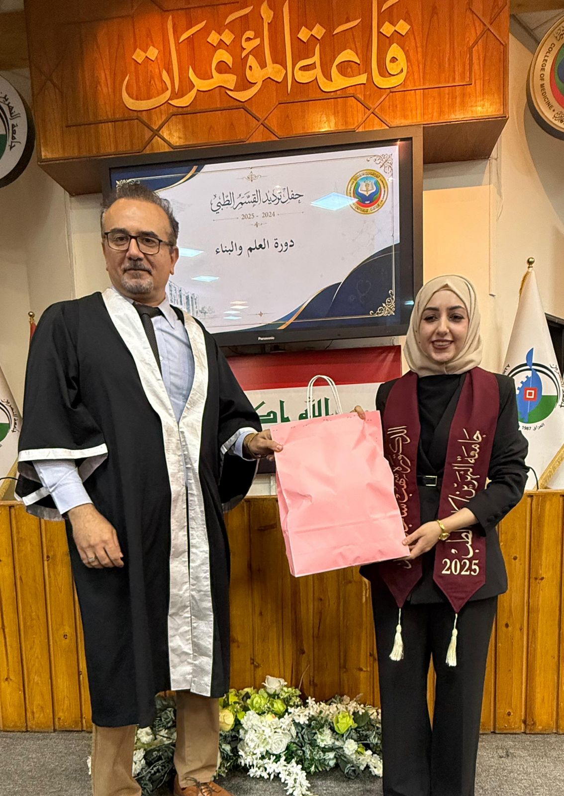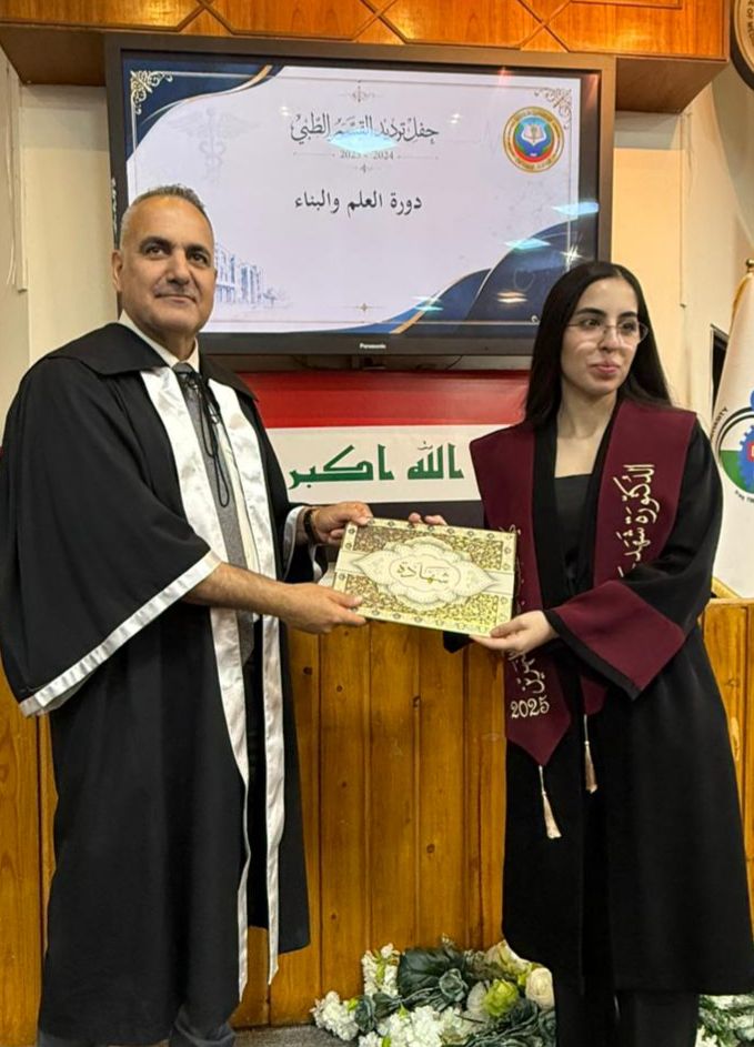 Under the patronage of the Dean of the College of Medicine at Al-Nahrain University, Professor Dr. (Anis Khalil Nayel), and in the presence of the Assistant Deans, Heads of Scientific Branches (Members of the College Council), as well as the Director of Al-Imamain Al-Kadhimain Medical City, Dr. (Nabil Jaber Al-Anzi), and a number of graduates’ families, the College of Medicine held the Medical Oath Ceremony for the graduates of the academic year 2024–2025 (Excellence and Creativity Class).
