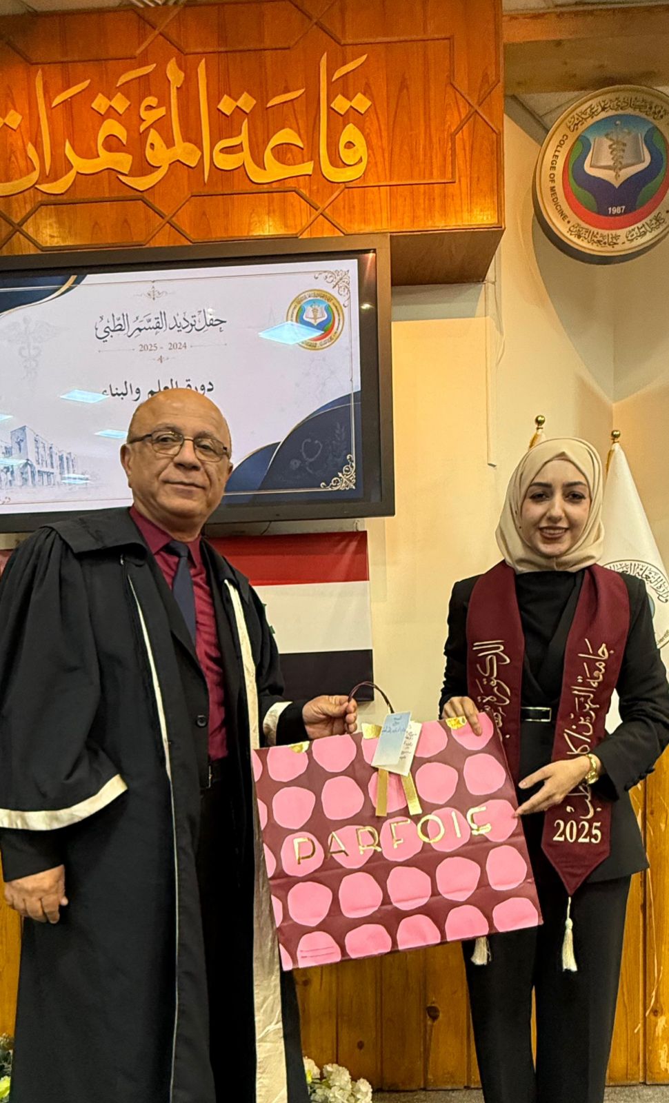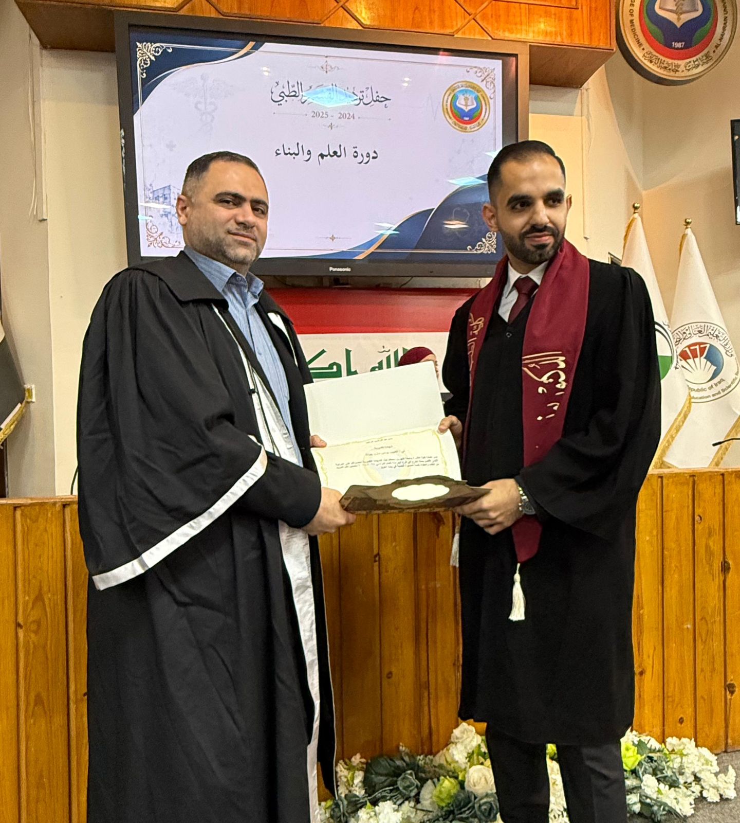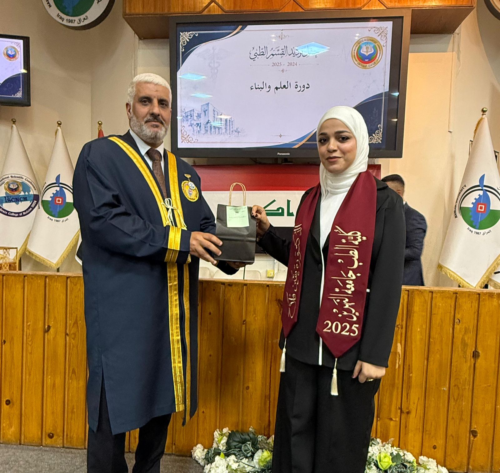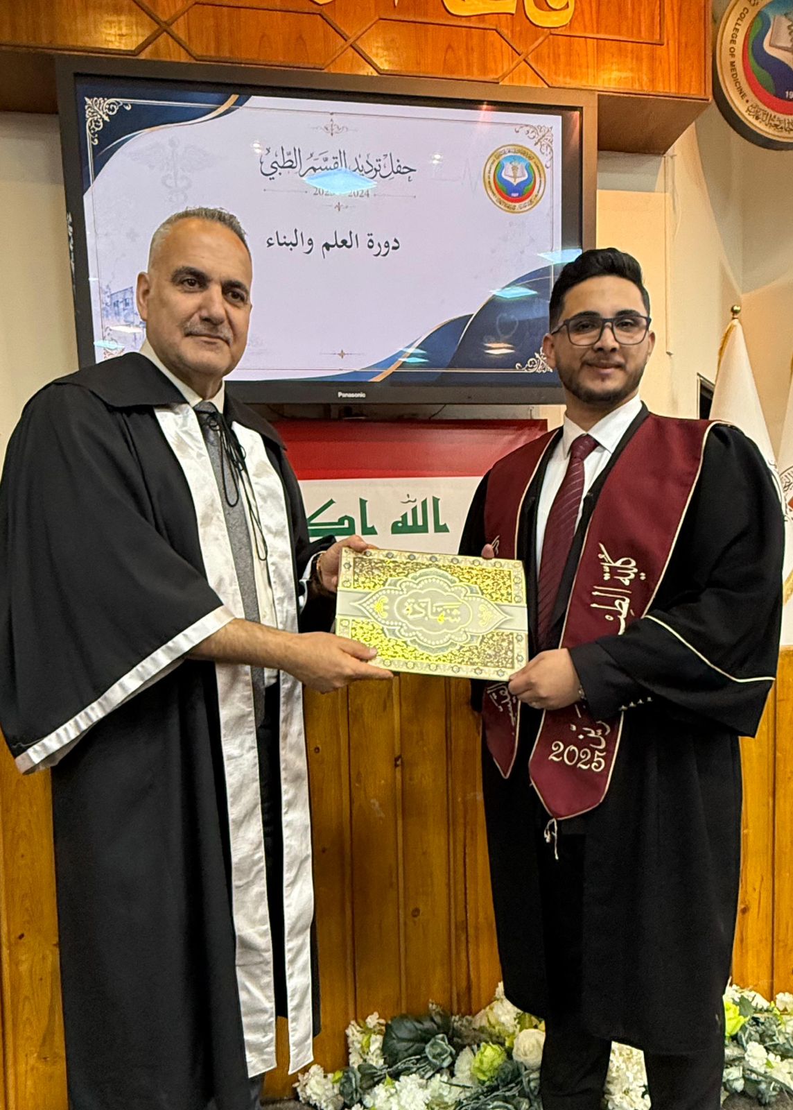 Under the patronage of the Dean of the College of Medicine at Al-Nahrain University, Professor Dr. (Anis Khalil Nayel), and in the presence of the Assistant Deans, Heads of Scientific Branches (Members of the College Council), as well as the Director of Al-Imamain Al-Kadhimain Medical City, Dr. (Nabil Jaber Al-Anzi), and a number of graduates’ families, the College of Medicine held the Medical Oath Ceremony for the graduates of the academic year 2024–2025 (Excellence and Creativity Class).