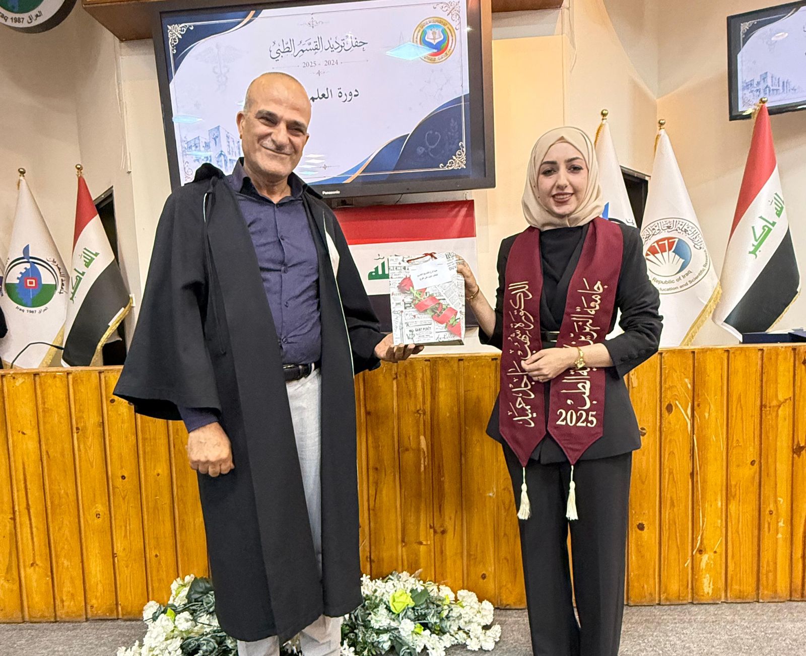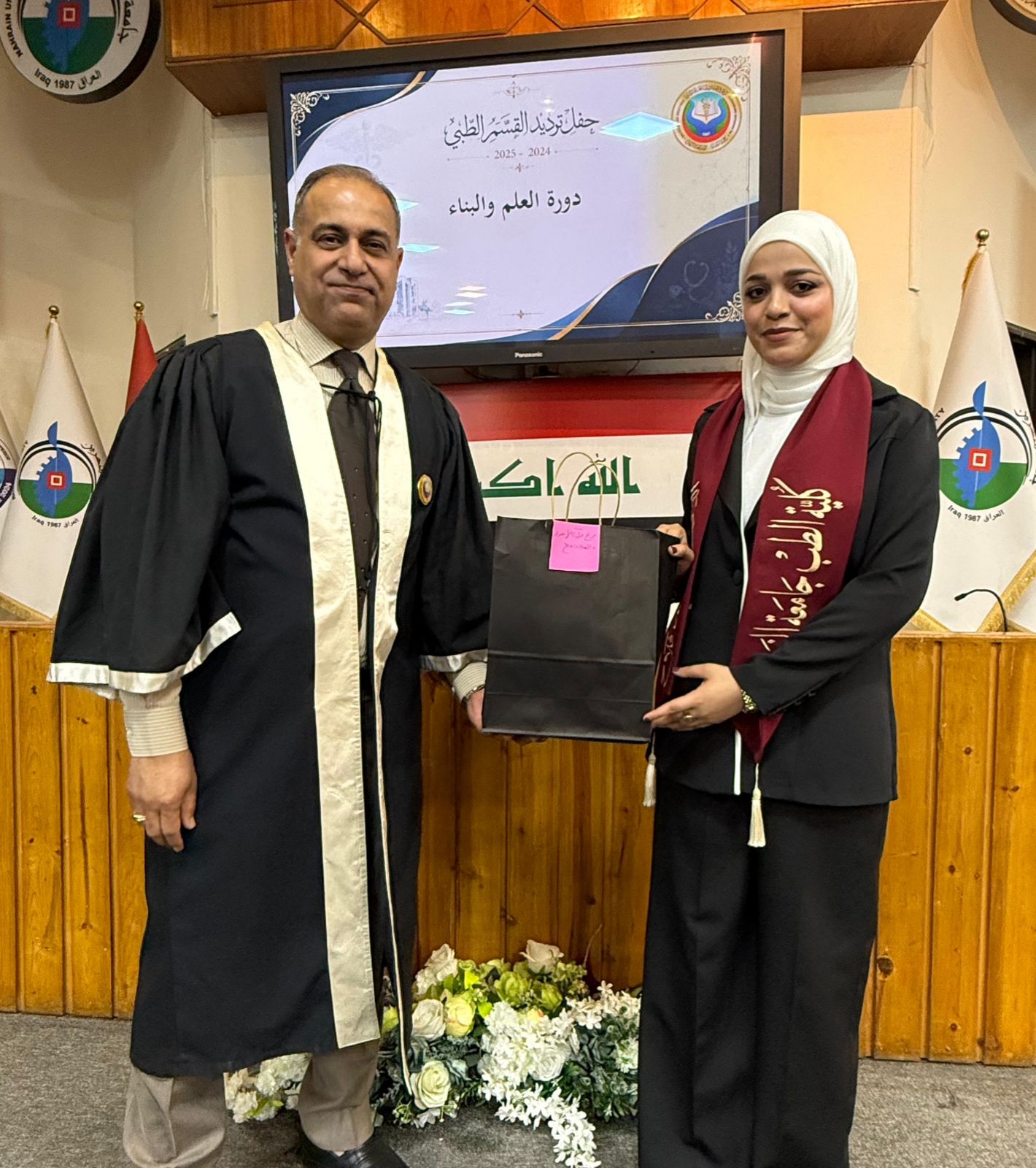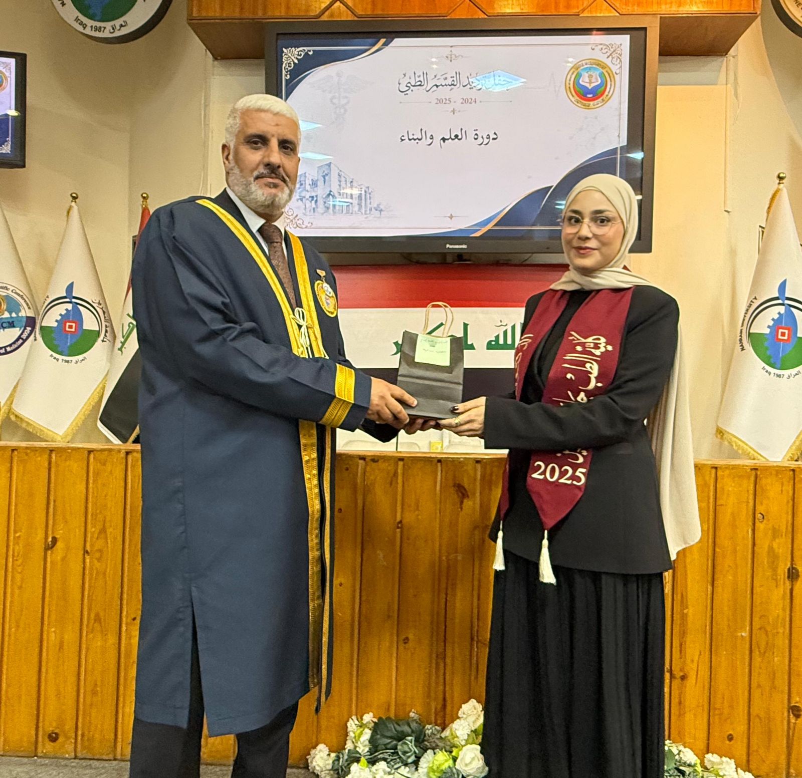 The ceremony commenced with the recitation of verses from the Holy Qur’an by sixth-year student (Sajjad Abdulaziz), followed by the recitation of Surah Al-Fatiha in honor of the souls of Iraq’s martyrs, and then the Iraqi national anthem was played.