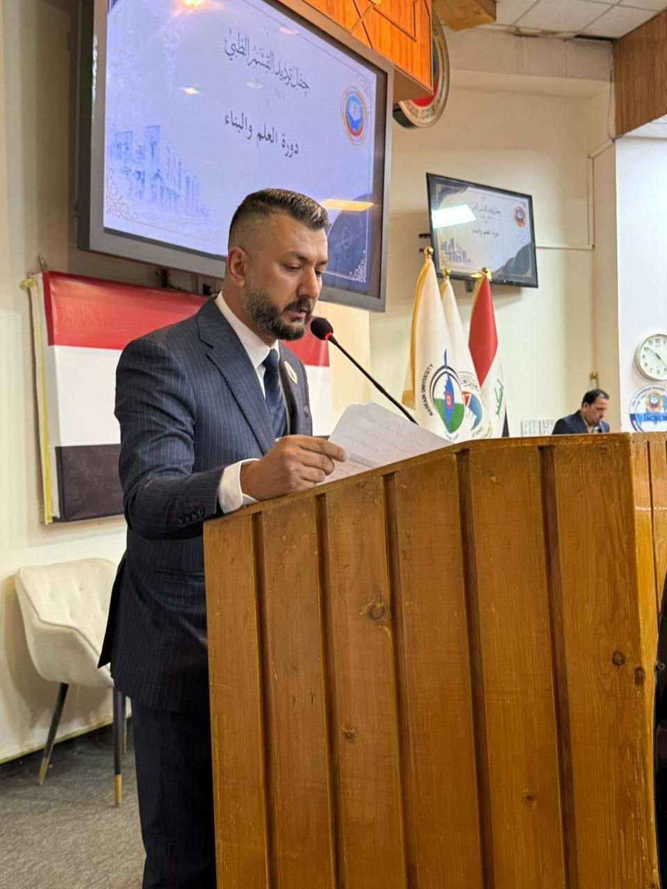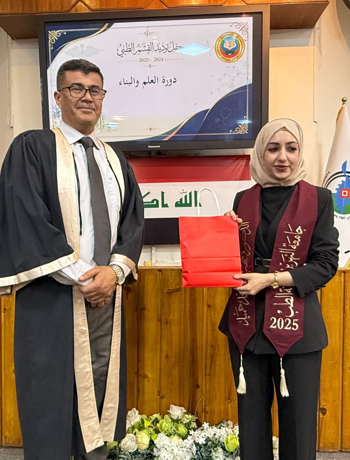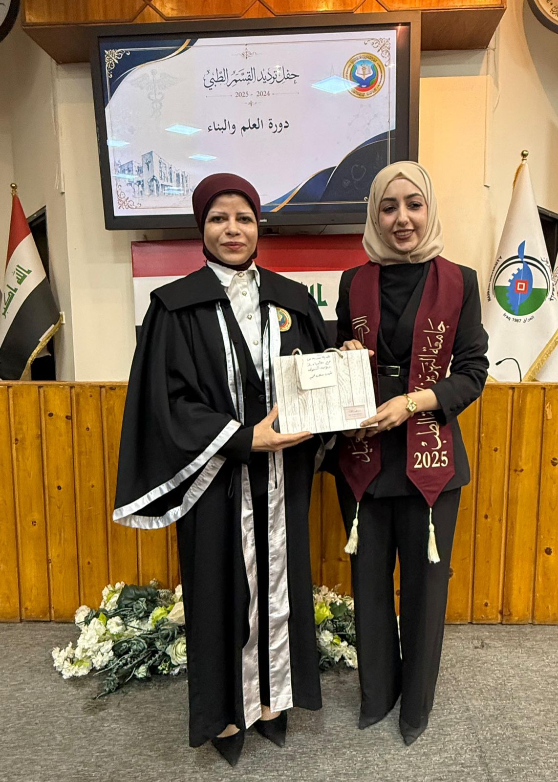 The ceremony commenced with the recitation of verses from the Holy Qur’an by sixth-year student (Sajjad Abdulaziz), followed by the recitation of Surah Al-Fatiha in honor of the souls of Iraq’s martyrs, and then the Iraqi national anthem was played.