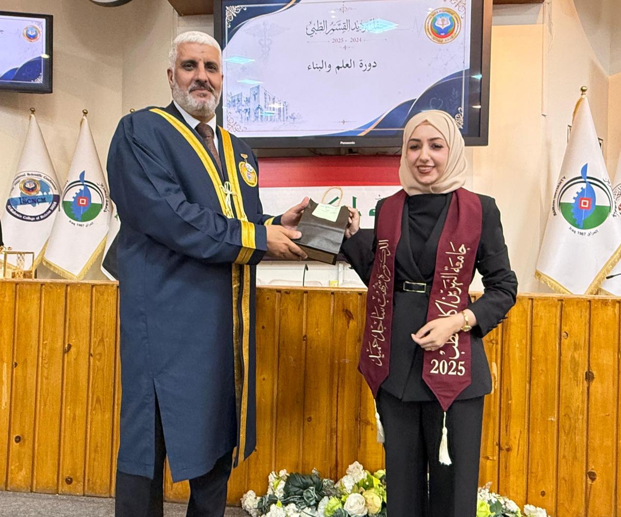 The ceremony also featured a speech by the top-ranked graduate of the class, (Shahab Sajid Hameed), who expressed gratitude and appreciation to the College Deanship and faculty members for their continuous support, and acknowledged the vital role of her family throughout her academic journey.