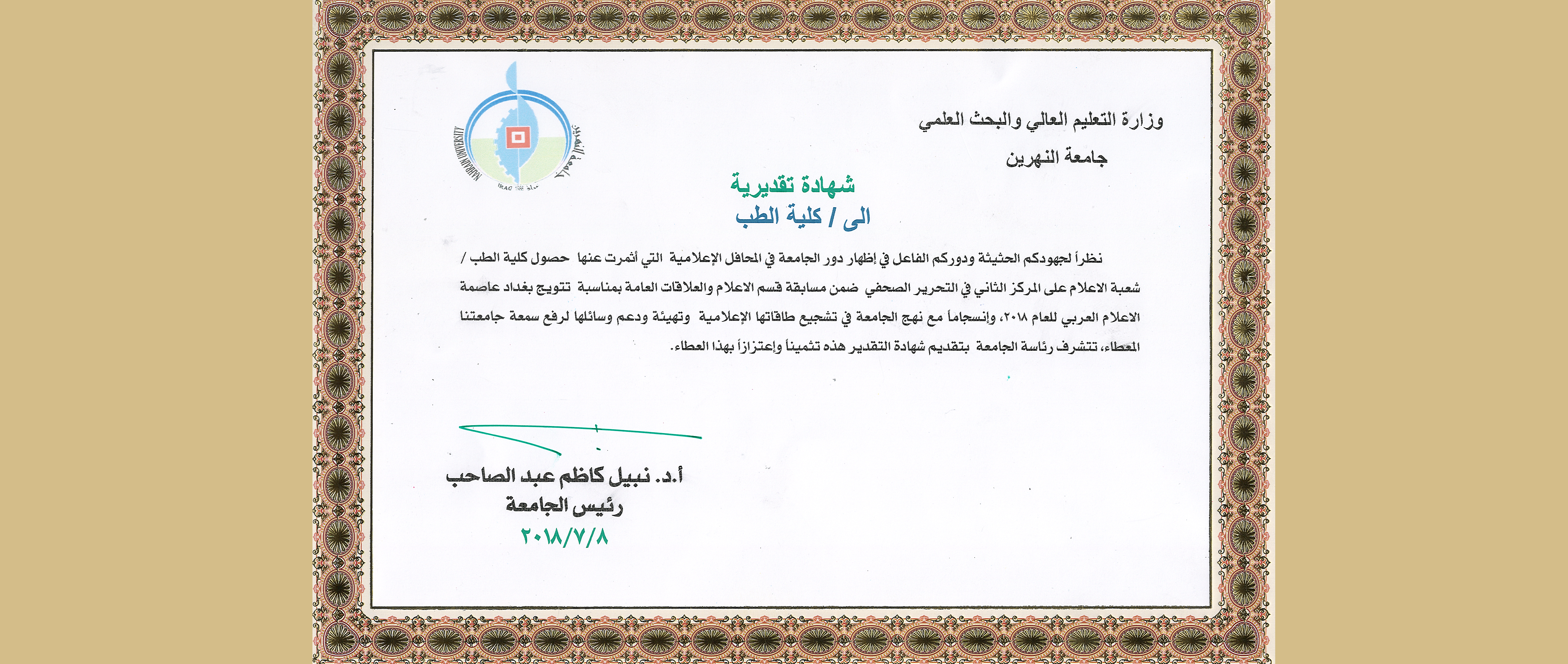 On 20th /5/2018, and as a part of Al-Nahrain University 2018 Awards, and on behalf of the College Council, the Dean of the College of Medicine/ Al-Nah...