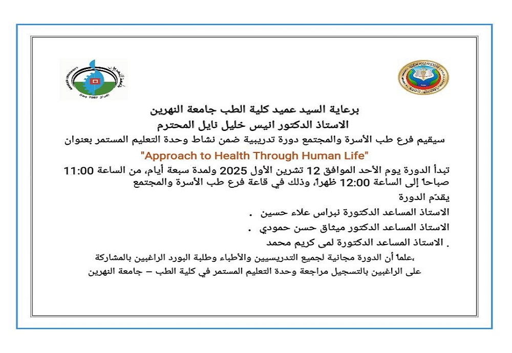 برعاية عميد كلية الطب – جامعة النهرين الأستاذ الدكتور أنيس خليل نايل، سيقيم فرع طب الأسرة والمجتمع دورة تدريبية ضمن نشاط وحدة التعليم المستمر بعنوان: "Approach to Health Through Human Life" تبدأ الدورة يوم الأحد الموافق 12 تشرين الأول 2025 ولمدة سبعة أيام، من الساعة 11:00 صباحاً إلى 12:00 ظهراً، وذلك في قاعة فرع طب الأسرة والمجتمع. يقدّم الدورة: الاستاذ المساعد الدكتورة نبراس علاء حسين الاستاذ المساعد الدكتور ميثاق حسن حمودي الاستاذ المساعد الدكتورة لمى كريم محمد