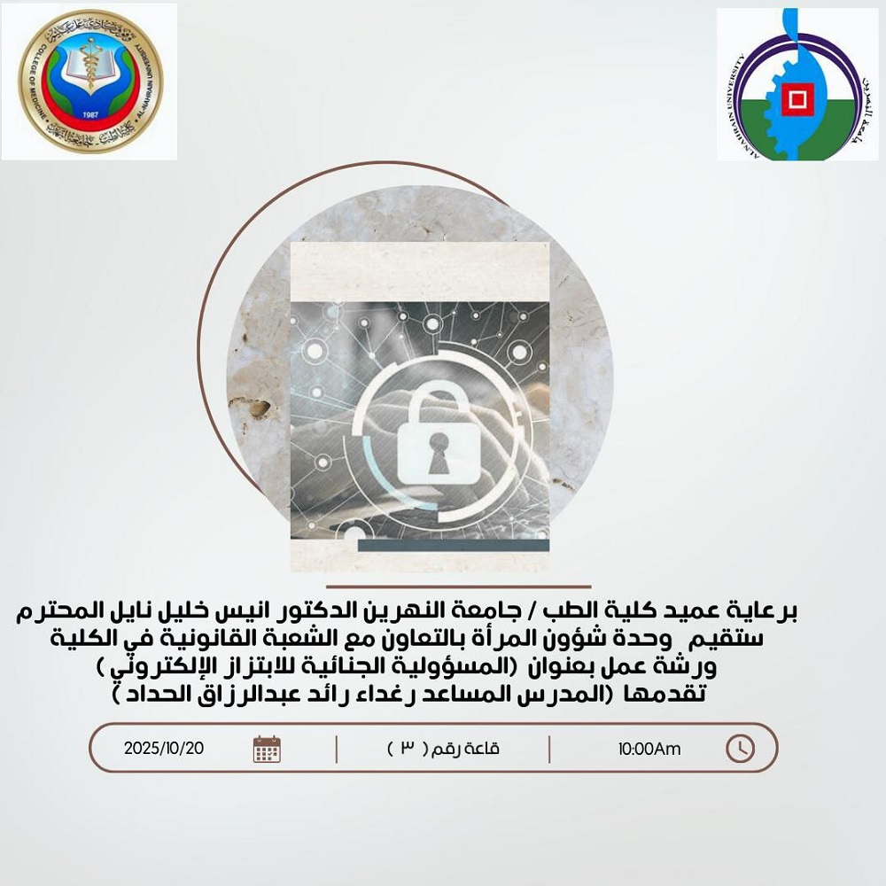 برعاية السيد عميد كلية الطب / جامعة النهرين (الأستاذ الدكتور أنيس خليل نايل) المحترم ستقيم وحدة شؤون المرأة بالتعاون مع الشعبة القانونية في الكلية ورشة عمل بعنوان (المسؤولية الجنائية للابتزاز الإلكتروني) تقدمها (المدرس المساعد رغداء رائد عبدالرزاق الحدّاد) وذلك في يوم الاثنين الموافق 2025/10/20، في تمام الساعة 10:00 صباحاً، في القاعة رقم (3) من ضمن بناية قاعة المؤتمرات في كلية الطب جامعة النهرين .
