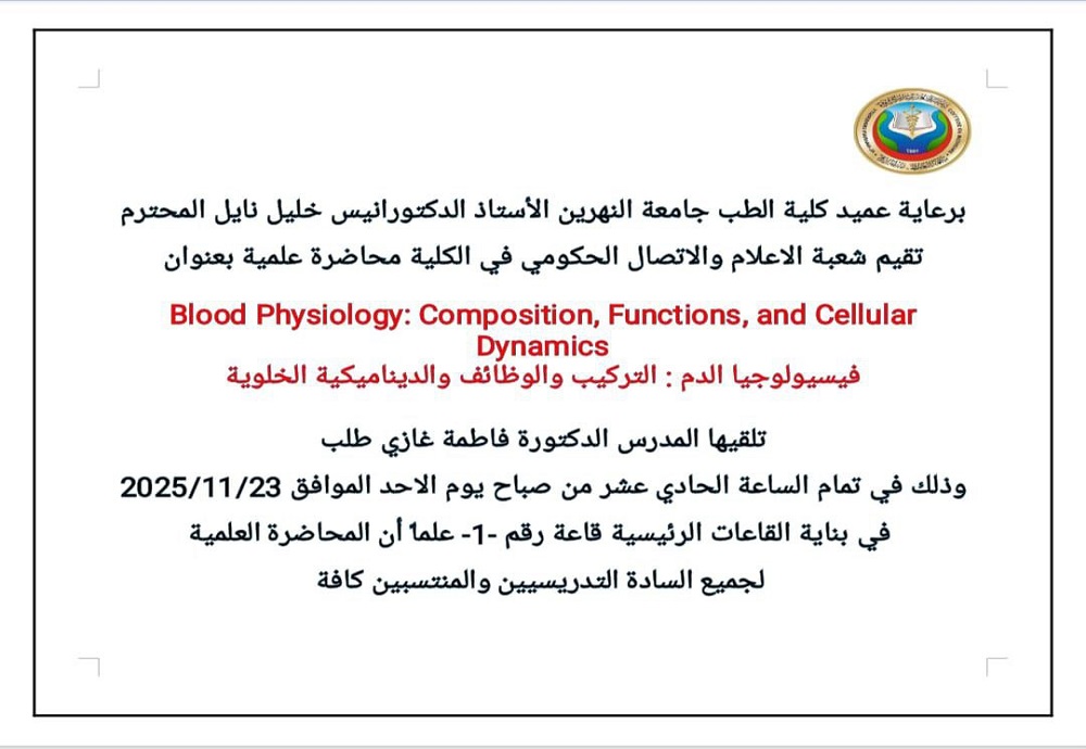 تحت رعاية عميد كلية الطب في جامعة النهرين، الأستاذ الدكتور أنيس خليل نايل، تقيم شعبة الإعلام والاتصال الحكومي في الكلية محاضرة علمية بعنوان: فيسيولوجيا الدم: التركيب والوظائف والديناميكية الخلوية تلقيها المدرس الدكتورة فاطمة غازي طلب. ستُعقد المحاضرة في تمام الساعة 11:00 صباحاً من يوم الأحد، 23 تشرين الثاني 2025، في البناية الرئيسية، القاعة رقم 1. وتجدر الإشارة إلى أن المحاضرة العلمية مفتوحة لجميع السادة التدريسيين والمنتسبين.