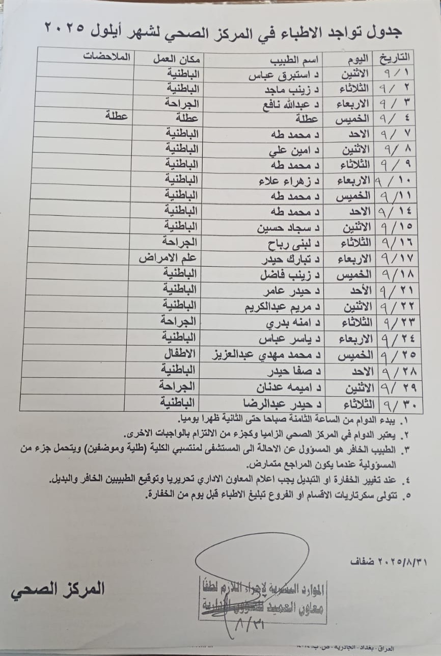 جدول خفارات الاطباء في المركز الصحي لشهرايلول 2025