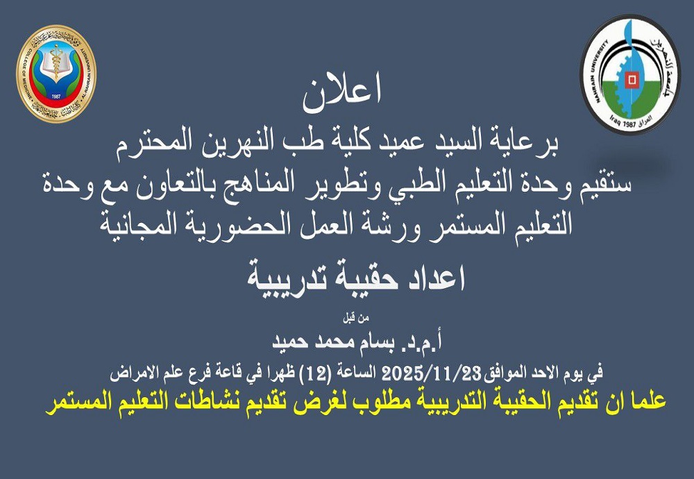 برعاية السيد عميد كلية الطب في جامعة النهرين، تقيم وحدة التعليم الطبي وتطوير المناهج، وبالتعاون مع وحدة التعليم المستمر، ورشة عمل حضورية مجانية بعنوان: إعداد حقيبة تدريبية يقدمها: الأستاذ المساعد الدكتور بسام محمـد حميد في يوم الأحد الموافق 23 نوفمبر 2025، الساعة 12:00 ظهرًا، في قاعة فرع علم الأمراض. يرجى الملاحظة أن تقديم الحقيبة التدريبية مطلوب لغرض التقديم على نشاطات التعليم المستمر.